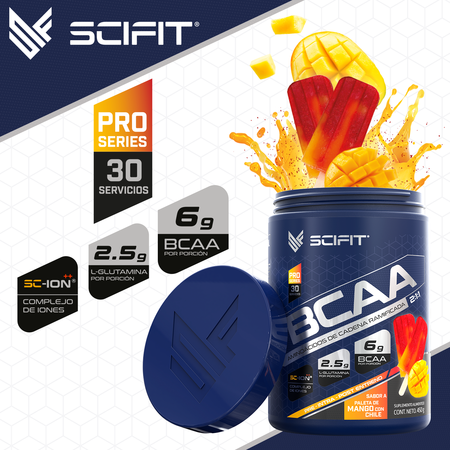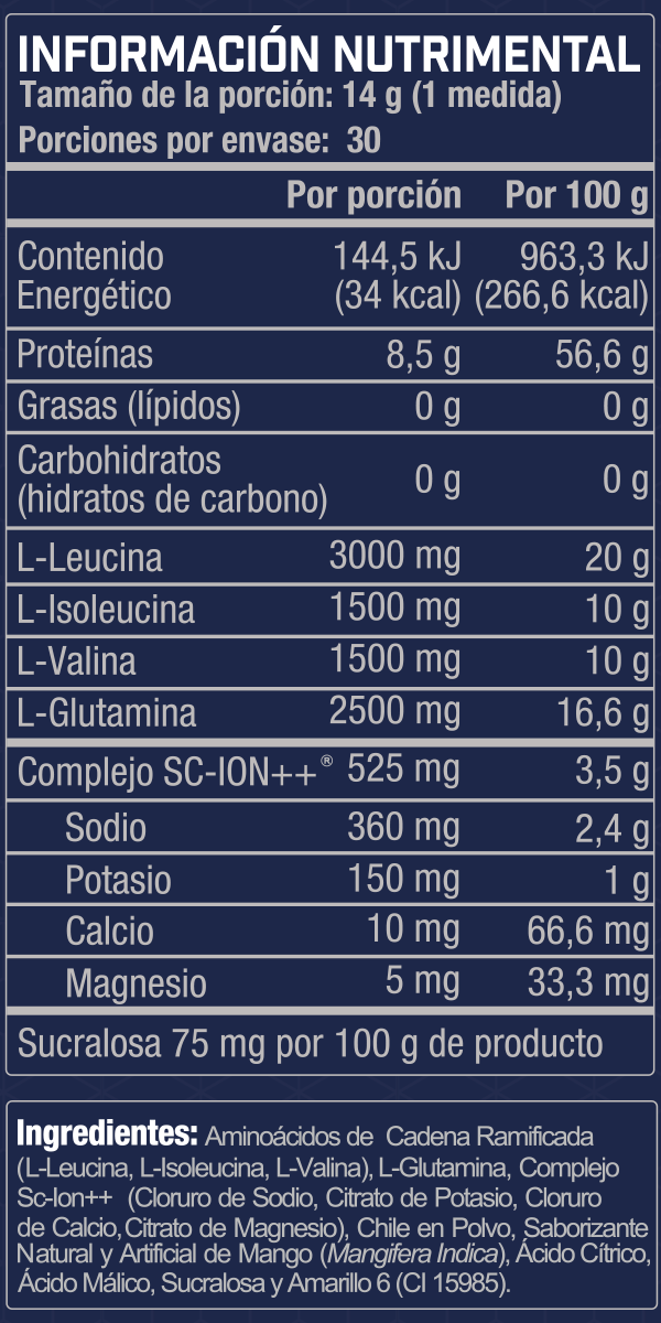 INGREDIENTES: Aminoácidos de Cadena Ramificada (L-Leucina, L-Isoleucina, L-Valina), L-Glutamina, Complejo Sc-Ion++ (Cloruro de Sodio, Citrato de Potasio, Cloruro de Calcio, Citrato de Magnesio), Chile en Polvo, Saborizante Natural y Artificial de Mango (Mangifera Indica), Ácido Cítrico, Ácido Málico, Sucralosa y Amarillo 6 (CI 15985).
