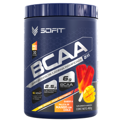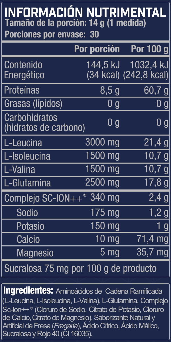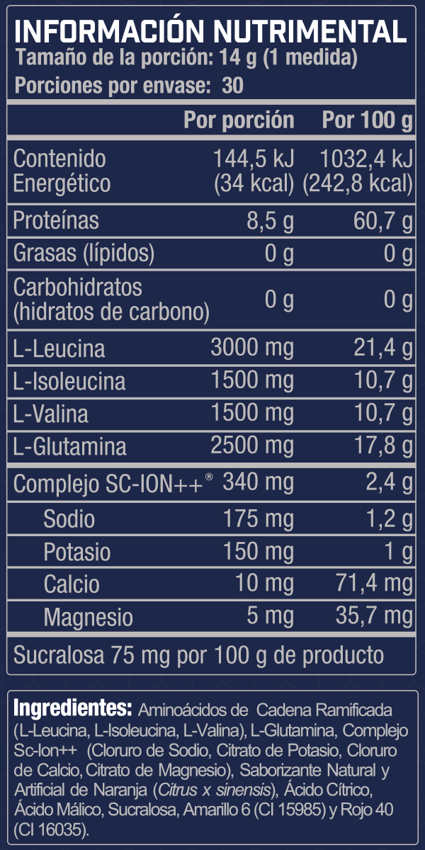 INGREDIENTES: Aminoácidos de Cadena Ramificada (L-Leucina, L-Isoleucina, L-Valina), L-Glutamina, Complejo Sc-Ion++ (Cloruro de Sodio, Citrato de Potasio, Cloruro de Calcio, Citrato de Magnesio), Chile en Polvo, Saborizante Natural y Artificial de Mango (Mangifera Indica), Ácido Cítrico, Ácido Málico, Sucralosa y Amarillo 6 (CI 15985).