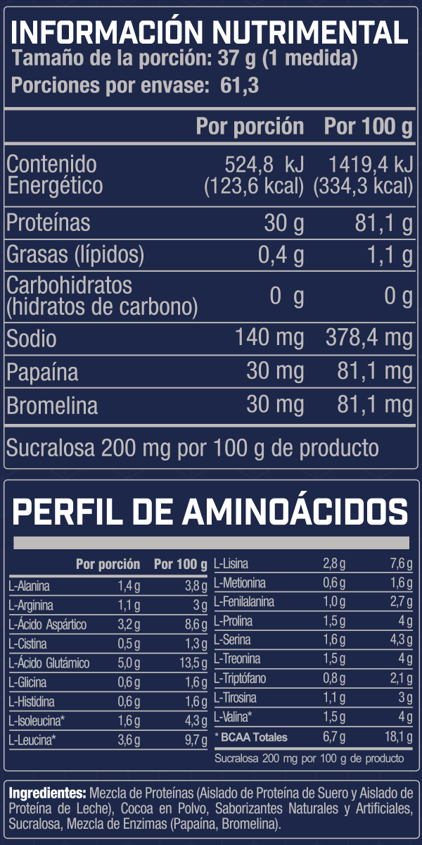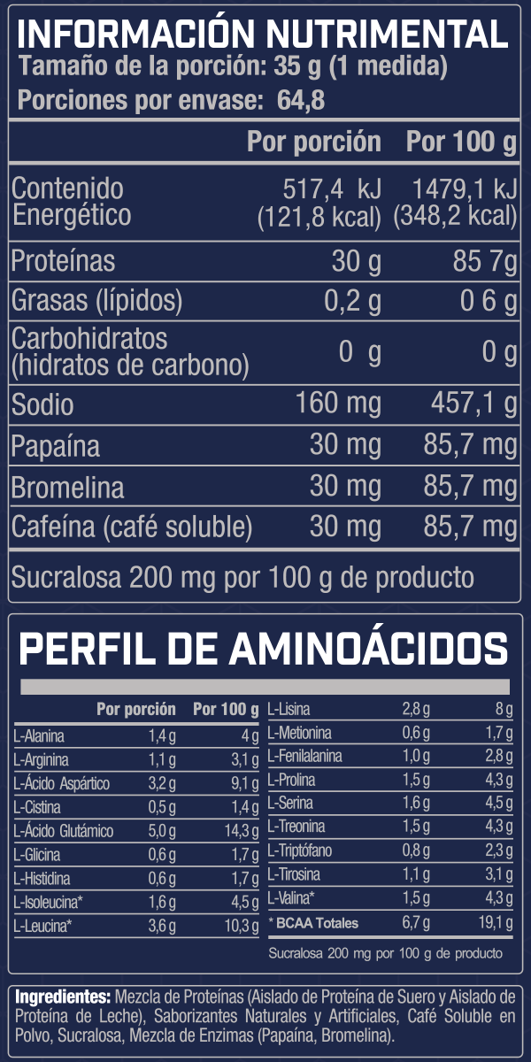 INGREDIENTES: Mezcla de Proteínas (Aislado de Proteína de Suero y Aislado de Proteína de Leche), Saborizantes Naturales y Artificiales, Café Soluble en Polvo, Sucralosa, Mezcla de Enzimas (Papaína, Bromelina).
